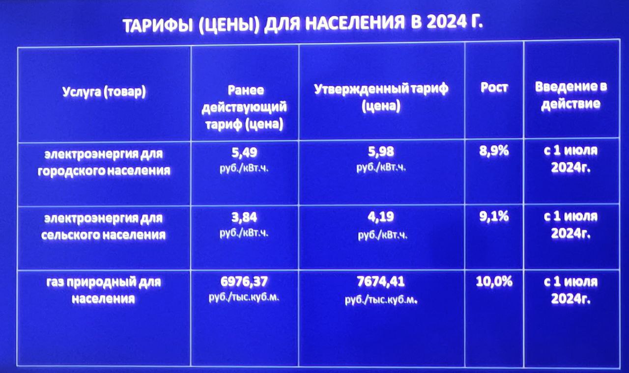 Напомним, в регионе устанавливаются единые тарифы на электроэнергию. Для горожан размер тарифа составит 5,98 руб./кВт*ч , для жителей сельских населенных пунктов — 4,19 руб./кВт*ч . Стоимость природного газа составит 7674,41 руб./тыс. куб. м.