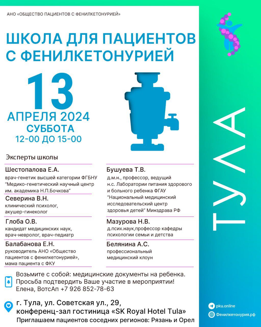 В Тулу приедут ведущие российские эксперты в области редких болезней обмена веществ. Пациенты смогут обсудить с экспертами суть заболевания и необходимость пожизненного соблюдения диеты, узнать об особенностях самочувствия и причинах его изменения, научиться самостоятельного рассчитывать диету и многое другое.